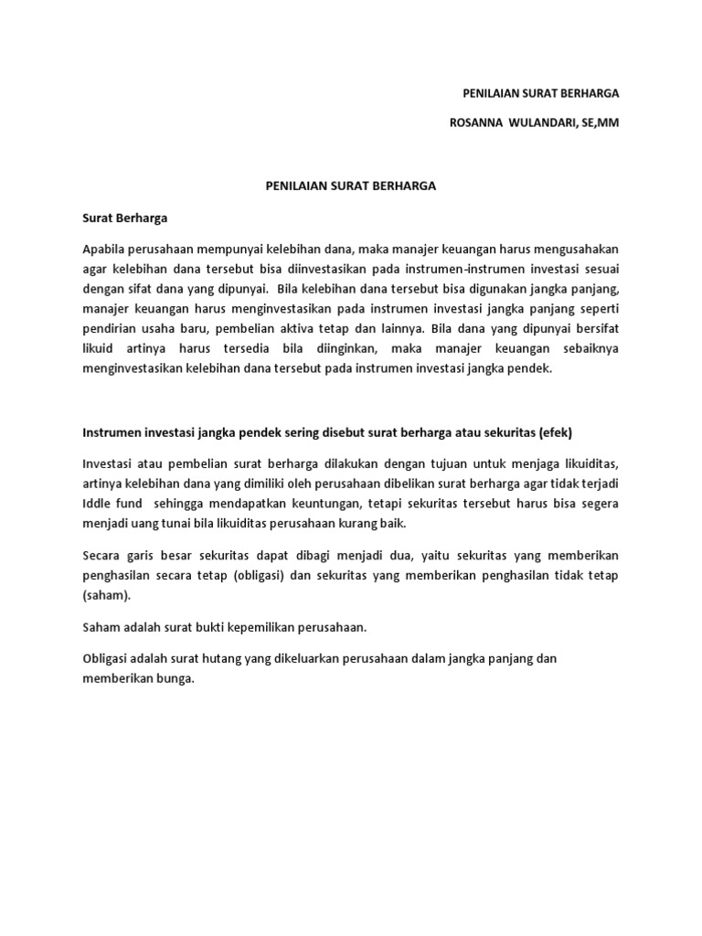 Doc Manajemen Kas Dan Surat Berharga Rahmad Ibrahim Academiaedu. Jawab Saham preferen disebut sebagai surat-surat berharga hibrid karena memiliki banyak karakteristik baik dari saham biasa maupun dari obligasi. Analisis dan penilaian surat berharga dari perusahaan bertujuan untuk memanfaatkan kelebihan dana yang ada diperusahaan dengan melakukan investasi dalam waktu singkat.