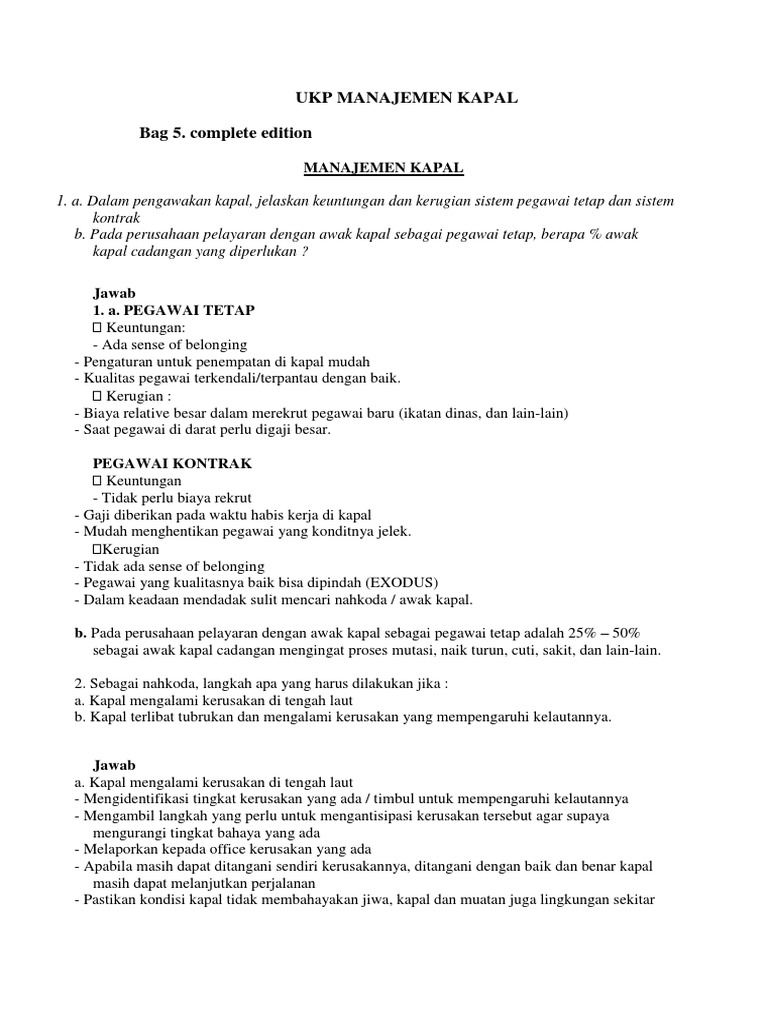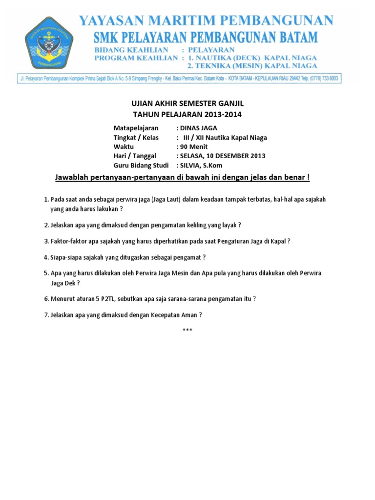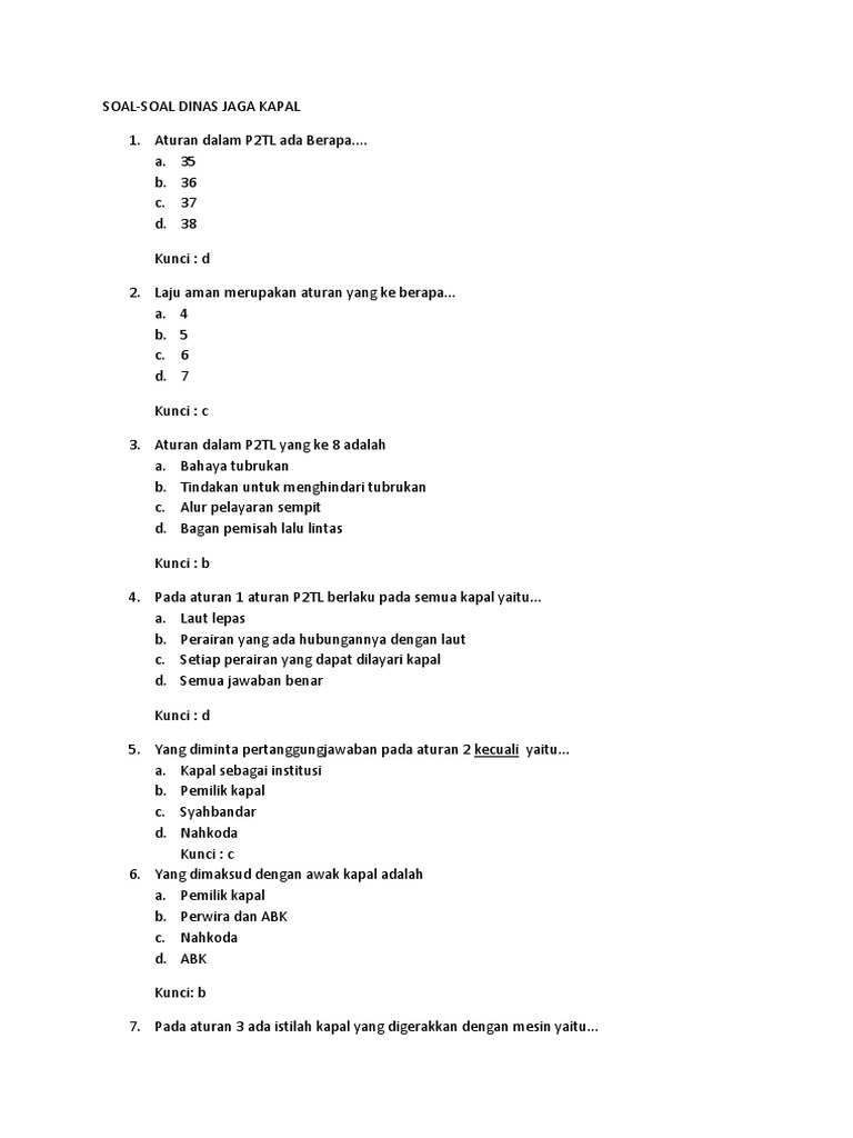 Kumpulan soal dinas jaga kapal. Soal-latihan-pilihan-ganda-dinas-jaga-kapal-perika Berikut ini adalah file tentang soal-latihan-pilihan-ganda-dinas-jaga-kapal-perika yang bisa kalian unduh secara gratis dengan menekan tombol download pada tautan link di bawah ini. Doc P2tl Dinas Jaga Soal Kevien Herlambang Academia Edu Cermat menyatakan memberikan perhatian penuh dan mengawasi dengan waspada atau menjaga kapal dengan seksama. SAUDARA SEBAGAI MASINIS SEDANG MELAKSANAKAN TUGAS JAGAPELABUHAN SEDANGKAN DI PALKA SEDANG MELAKUKAN KEGIATAN BONGKAR MUAT BEKERJA DENGAN 3 BATANG PEMUAT PADA SAAT ANDA MENGONTROL SUHU GAS BUANG AUXILIARY ENGINE N0.