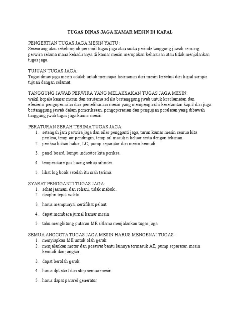 SOAL DAN JAWABAN DINAS JAGA KAMAR MESIN DI KAPAL 1. Chandra Edy Antocho Latar Belakang. Namun berikut ini adalah jenis-jenis tugas jaga yang biasanya diberlakukan diatas.