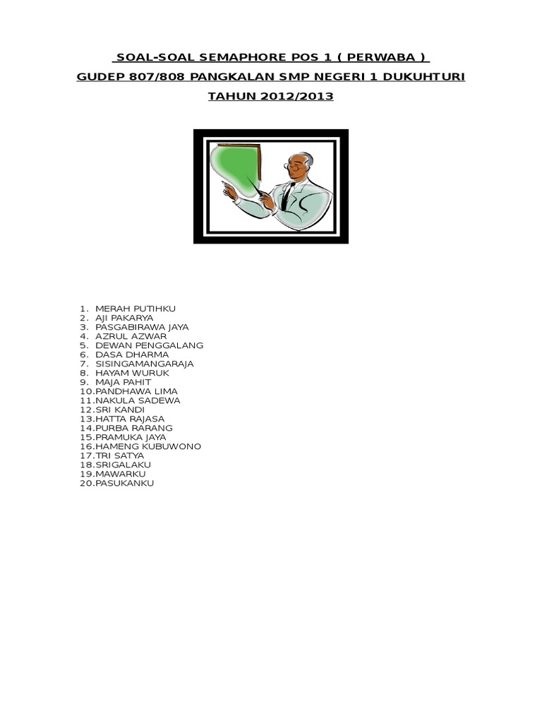 Pada kesempatan kali ini kakak akan membagikan kumpulan soal-soal pramuka untuk penggalang dan siaga. Berikut ini adalah kumpulan dari berbagi sumber tentang soal semaphore yang bisa gunakan untuk file revisi dan diunduh secara gratis dengan menekan tombol download biru dibawah ini. Oleh karena itu Posisi tangan akan diganti dengan angka dari 1 sd 7.