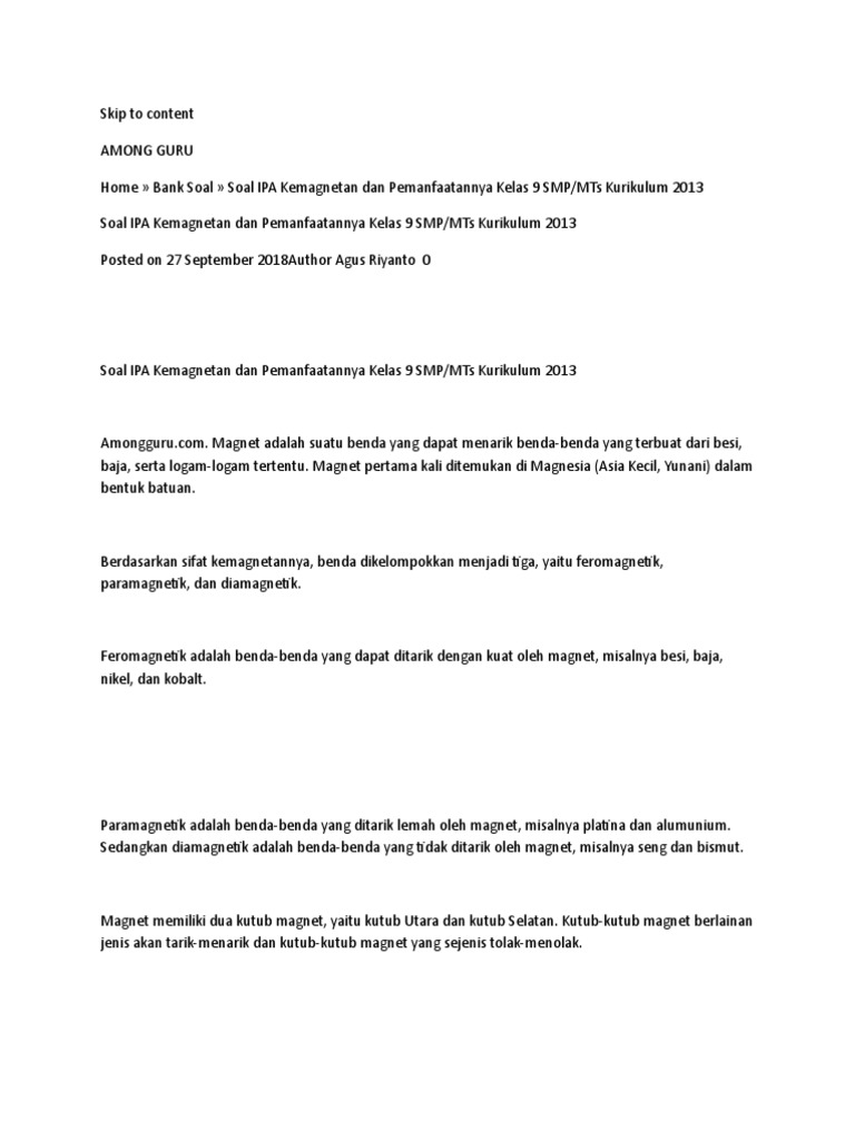 Soal Ipa Kemagnetan Dan Pemanfaatannya Kelas 9 Smp Mts Kurikulum 2013
